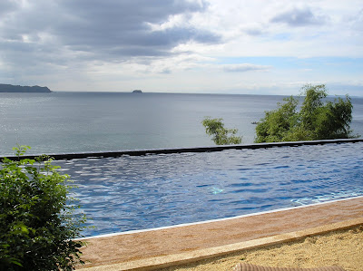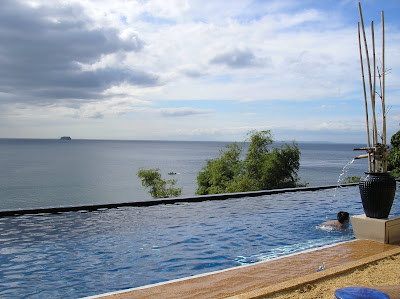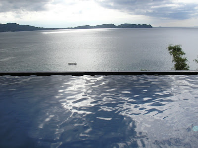 Last Nov. 29-30, the clinic where my husband works as a consultant had a "team-building/strategic planning" workshop (read: clinic outing) at this beautiful resort (Vivere Azure) in Anilao, Batangas, south of Manila, on the southern part of Luzon Island.While my husband was at the strategic planning workshop, the kids went a-swimming in the tiny infinity pool. I looked after them while sitting in the shade of the welcome hut/front lobby of the resort. This was a real infinity pool, the edge of the pool was parallel to the horizon and there were no trees in the way. There was a sheer drop at the edge of the pool. The view was breathtaking.