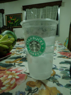 Here's a use for the Starbucks cold drink plastic cup--as a mold to make ice. And a large piece of ice at that.